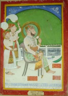 | Description / विवरण | Miniature painting depicting Maharaja Satrasal Bahadur sitting on a chair. He is adorned with jewels and holding a flower with right hand and a sword with left hand. There are two male chauri bearers behind him. |