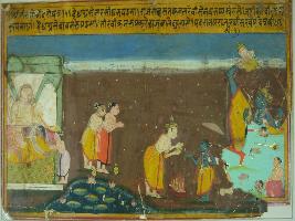 | Description / विवरण | Miniature painting based on Geet Govind depicting Narasimha avatar on the right hand side of the painting. While on the centre Vamana avatar of Vishnu is depicted and on it left Trivikram Mudra of lord Vishnu is depicted and lord Brahma touch his feat. |