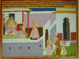 | Description / विवरण | Miniature painting based on Kadambari depicting sitting on throne and an old women wearing a sword is shown with folded hand in a palace at extreme right to its left, women is shown leaving. At the left part, women is shown with rest of family member including old man, his daughter and their son. |