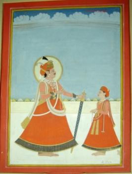 | Description / विवरण | Miniature portrait of Maharaja Sawai Pratap Singh in standing position facing left and talking to an attendant. He is holding a sword with left hand and a rosary with right hand. A halo is seen behind his head. |
