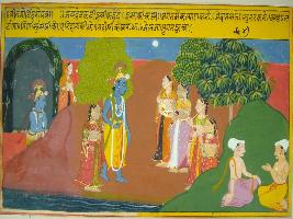 | Description / विवरण | Miniature painting based on Geet Govind depicting poet Jaidev narrating the scene. Jaidev says that Krishna doing good to all, and who see his face in the morning in blessed by him. At the centre Radha and Krishna seen together meeting some gopis. |