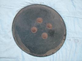 | Description / विवरण | It is a shield made by Rhinoceros skin it has a low raised border. It is concave and circular shape. It has provision for holding cloth belt & iron bolts in the front side it has 4 knobs decorated . It is painted in black colour. |