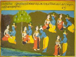 | Description / विवरण | Miniature painting based on Geet Govind depicting Krishna doing Shringar of Radha with his own hands. |