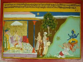 | Description / विवरण | Miniature painting based on Kadambari depicting a king in his court with his peoples. In lower left part, Lord Vishnu is depicted killing demons. |