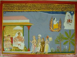 | Description / विवरण | Miniature painting based on Kadambari depicting a king listening to his peoples in his court. In left part, a yogi is depicted performing penance, sitting on fire for Shiv and Shiv appears before him. |