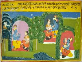 | Description / विवरण | Miniature painting based on Geet Govind depicting Krishna and Radha all over the painting seated in a vana garden . Painting depicts Krishna s love for Radha. |