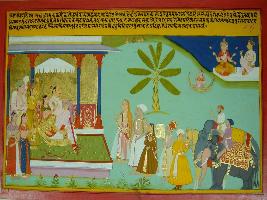 | Description / विवरण | Miniature painting based on Kadambari depicting sitting on throne and behind him, female chauri bearer is standing. king is talking to family of an old men with his wife holding sword, his daughter and son holding cage in his hand. At the upper middle part Lord Vishnu is seen talking to Lakshmi. |