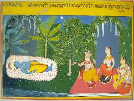 | Description / विवरण | Miniature painting based on Geet Govind depicting Radha sitting and talking with her friend at the left part. Krishna is shown lying on bed of lotus at the right part of painting. |