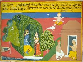 | Description / विवरण | Miniature painting based on Geet Govind depicting Krishna and Radha seated in a garden on the right hand side of the painting and on its right Kamdev, is seen seated on a tree, while lord Brahma is seen on the top, on the left side of the painting. |