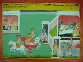 | Description / विवरण | Miniature painting based on Mahabharat - Udyam parva depicting Arjun and Duryodhan came to meet Krishna to ask for help together. Krishna was sleeping and later he awake and ask them that What they want- either Narayan or Narayani sena. Then Duryodhan says that, as he came earlier, so he is having right to ask first. Then Krishna give him the option and Duryodhan ask for Narayani sena. |