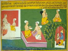 | Description / विवरण | Miniature painting based on Geet Govind depicting poet Jaidev telling the people about his poem. He says that his poems are full of seven Rasas , ever lasting and includes hearty devotion towards Krishna and love of Radha and Krishna. At the lover left corner Radha and Krishna is depicted sitting on a garden. |