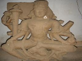 | Description / विवरण | An independent sculpture of Baikunth Vishnu sitting on Garuda in Lalitasana. Attributes from right below. 1 not visible 2 missing 3 holding mace 4 missing 5 missing 6 holding Shankh . Here the Vishnu having three faces 1 In the front Vishnu 2 towards right from front face the depiction of Boar incarnation 3 left from front face depicts the Narasimha incarnation. The figure is adorned with necklace and armlets having Kirti mukuta along with a vanmala. |