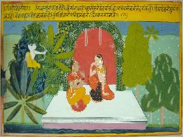 | Description / विवरण | Miniature painting based on Geet Govind depicting Radha and her Sakhi on the centre of the painting and Kamdev is seen seated on a tree on the right hand side of the painting. She says to Radha that, youth is not for ever. |
