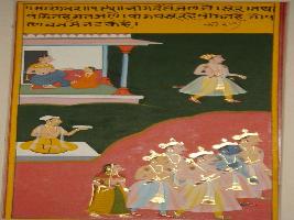 | Description / विवरण | Miniature painting based on Sarangadhar depicting mother and child in the upper right corner and a man is seen in left, while five Devpurush and a female are seen in the lower part of the painting. |