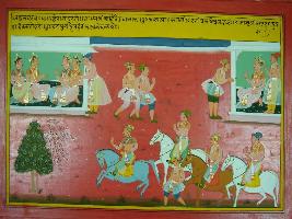 | Description / विवरण | Miniature painting based on Mahabharat - Udyam parva depicting Yudhisthir and Dhrupad discussing about the war and Duryodhan sent messenger to them. |