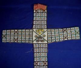 | Description / विवरण | Chaupar dices of conical shape and board completely made of tiny beads of various colours in floral pattern. Four dices are of yellow and green colours and other four dices are of green and pink colours. There are some holes and the base lining is torn. |