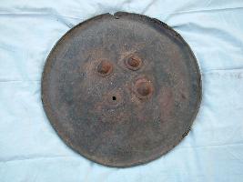 | Description / विवरण | This is a shield made by Rhinoceros s skin. It has a raised border in the front part. It has three knobs in the inner side it has leather belt for holding purpose. |