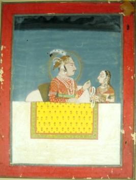 | Description / विवरण | Miniature painting depicting Maharana Raj Singh with his queen. Queen is depicting holding a mala with both hands. Both are well adorned with jewels. |
