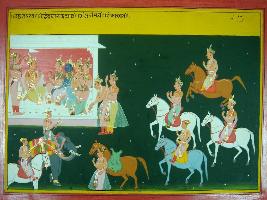 | Description / विवरण | Miniature painting based on Mahabharat - Udyam parva depicting on the upper right Pandavas sitting together, and armies on horseback and elephant back coming to them. |