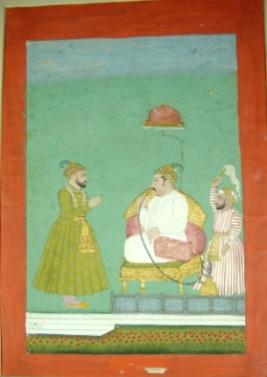 | Description / विवरण | Miniature painting depicting Mahmood Shah smoking hookah and sitting on a throne with a noble man standing in front and a male chauri bearer. |