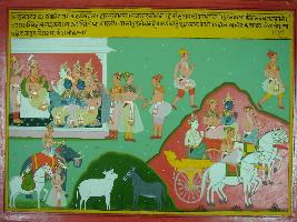 | Description / विवरण | Miniature painting based on Mahabharat - Udyam parva depicting Shri Krishna going to Dwarika with Yadavs while messenger informed Duryodhan about the departure of Krishna. |