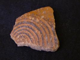| Description / विवरण | It is a red slipped, thin fabric well fired potsherd. It is painted with black colour on red background. The painting is of concentric circles. It is associated with OCP. |