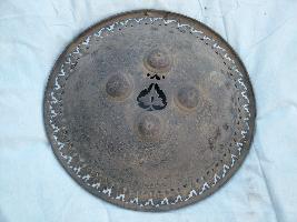 | Description / विवरण | This is shield made of copper which is concave from outside while concave from inner side. It is having lattice patterned decoration, painted floral designs, out twined edge and four shaped knobs on the out side. |