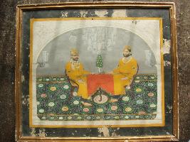 | Description / विवरण | It is a painting of two kings emperor in yellow dress. A table is shown having red cover over it and is shown in middle of two emperor. A glass pottery white is visible. |