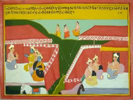 | Description / विवरण | Miniature painting based on Mahabharat - Udyam parva depicting the scene where king Janmajeya asking sage Vespayana that what did Pandavas and Kauravas talked in their tents in Kurukshetra. Then sage says that they talking about their power. |