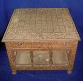 | Description / विवरण | Wooden stool having chess board on top and a drawer to keep dices below the board. It is decorated with carved vine and blossom design. The top has a crack running across it. |