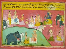 | Description / विवरण | Miniature painting based on Mahabharat - Udyam parva. The painting depicts Gaalava, who is thinking about god in his mind. He is thinks that if people use to perform yagna god get pleased and fulfill their wish. Than Garuda came and began talking with galab. |