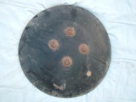 | Description / विवरण | It is a shield made by Rhinoceros skin. It has four decorated knobs. In the inner side it has grip for holding purpose. |