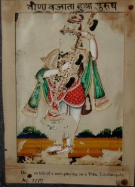 | Description / विवरण | Miniature painting depicting a male musician playing veena. Colour of his face and legs are flaked off. |