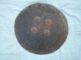 | Description / विवरण | It is a shield made by Rhinoceros skin, it is concave and circular shaped. It has body decorated. Its outer part is decorated with floral and cripple motifs. Internally it has provision for holding leather belt and iron bolts . |