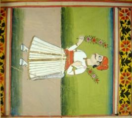 | Description / विवरण | Miniature painting depicting a man standing with flowers in both hands. He is wearing a red turban and white jama. |