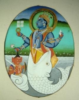 | Description / विवरण | Miniature painting depicting Vishnu in Matasya avatar. He is depicting killing the demon with his right hand and holding lotus, chakra, conch and mace in other hands. |