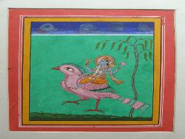 | Description / विवरण | It is a painting of Vishnu. Vishnu is shown on Garuda with his attributes like conch, mace, wheel and lotus. On top sky is visible. |