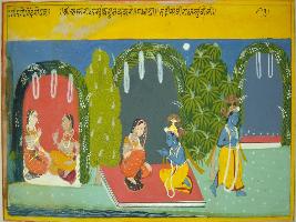 | Description / विवरण | Miniature painting based on Geet Govind. Krishna is depicted imitating Radha. It is scene in Vrindavan. Two women are depicted talking on one corner. |