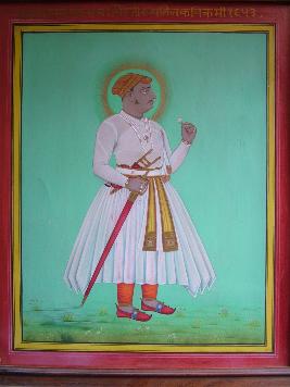 | Description / विवरण | This is a painting of Amar Singh which has been shown in standing posture. He is having a white tunic, red coloured shoes, a turban a scarf in waist, few chains of beads, and flowers have been shown. It is mounted in a wooden frame. |