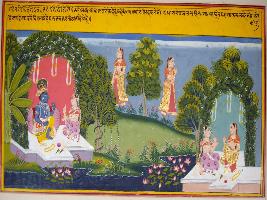 | Description / विवरण | Miniature painting based on Geet Govind depicting friend of Radha telling Krishna about Radha s state of mind that she is weeping in his separation. At the left side, Krishna is shown talking to her friend. At the right side, Radha is depicting looking sad because of her separation with Krishna. At the lower right, she is shown sitting with her friend and telling about her state of mind. |