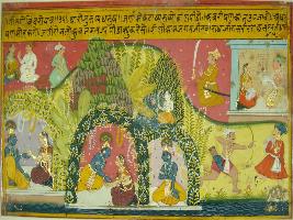 | Description / विवरण | Miniature painting based on Geet Govind depicting Krishna meeting with Radha, a man appreciating a merchant with bow and arrow at the lower left side. A man and a lady shown in the house and a man holding with sword. |