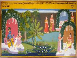 | Description / विवरण | Miniature painting based on Geet Govind depicting Gopi in front of Krishna and telling him about the Virah Vedna of Radha. |