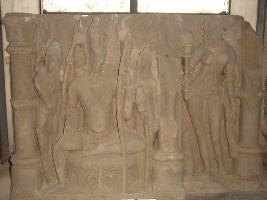 | Description / विवरण | A sculptured architectural fragment depicting Ram Durbar in a niche. In the centre Ram is sitting in Lalitasana on a cushioned pedestal. The right hand is chopped off and holding a bow in left hand. On his right the standing figure of Lakshman, his right hand is chopped off and holding a bow in left hand. On his left Sita is standing holding a fruit in right hand and left hand over the left thigh, their crowns necklaces, armlet and girdle are visible. On the left is a female chanwari bearer standing in tribhanga pose is separated by pillars. The sculpture is mutilated. |