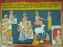 | Description / विवरण | Miniature painting based on Mahabharat - Udyam parva depicting that Bhishma is telling them about his curse in the court. Then Duryodhan tells they are winning because of him. |