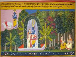 | Description / विवरण | Miniature painting based on Geet Govind depicting Krishna and Radha seen standing in the centre of the painting while on its right Krishna killed a demon and on the left hand side of the Radha seated with her friend. |