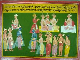 | Description / विवरण | Miniature painting based on Mahabharat - Udyam parva depicting Dhritrashtra saying that the people who are able to see Krishna are fortunate then Dhritrashtra presents his view that he want to go in the feet ok Krishna as his devotee. |