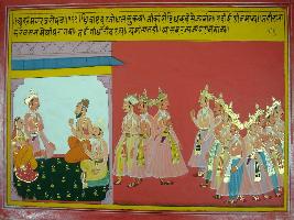 | Description / विवरण | Miniature painting based on Mahabharat - Udyam parva depicting Dhritrashtra telling Duryodhan not to go for war, Gandhari also tries to convince him but failed even Vyas also tries but he also failed. |