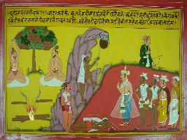 | Description / विवरण | Miniature painting based on Mahabharat - Udyam parva. On the painting Vidur says that a stay of a Kirat who went to bring a bee hives from Gandhmardhan Parvat but he couldn t do so and fall down. |
