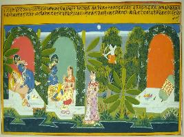 | Description / विवरण | Miniature painting based on Geet Govind depicting a loving union of Krishna with Radha. Kamdev is seen on the tree below the full night. |