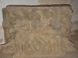 | Description / विवरण | A sculptured architectural fragment depicting a male figure adorned with necklace and girdle, playing manjeera, towards the left of the figure there is a dancing female figure, and towards extreme left there is depiction of another human figure whose legs are only visible. All the figure are defaced. Towards the right of the front view along with floral design a there is the depiction of a elephant head and a Vyala towards the left of the front view line is the depiction of an elephant and Vyala with the same description. |